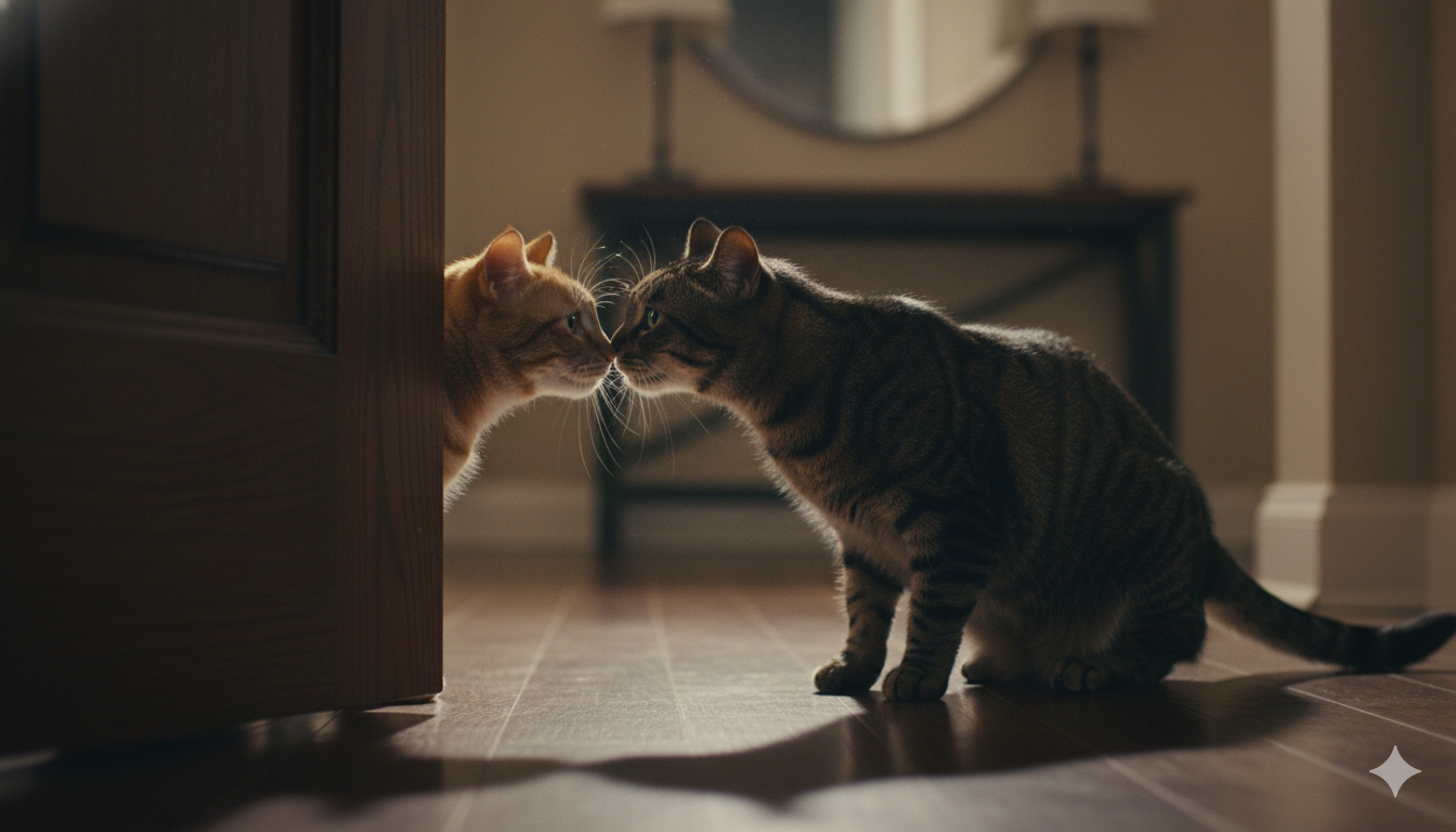 Before direct contact, allow them to see each other through a screen door or a transparent barrier. Crucially, feed both cats high-value treats during this time to create a positive association: "Seeing the other cat means something good happens."